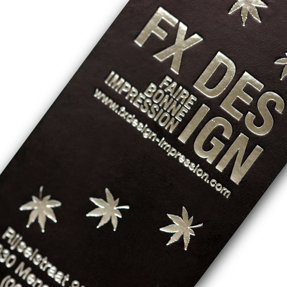 La carte de visite Argent à chaud consiste en l’application d’une mince feuille d’argent sur un papier (soit sur la totalité ou soit partiellement).
